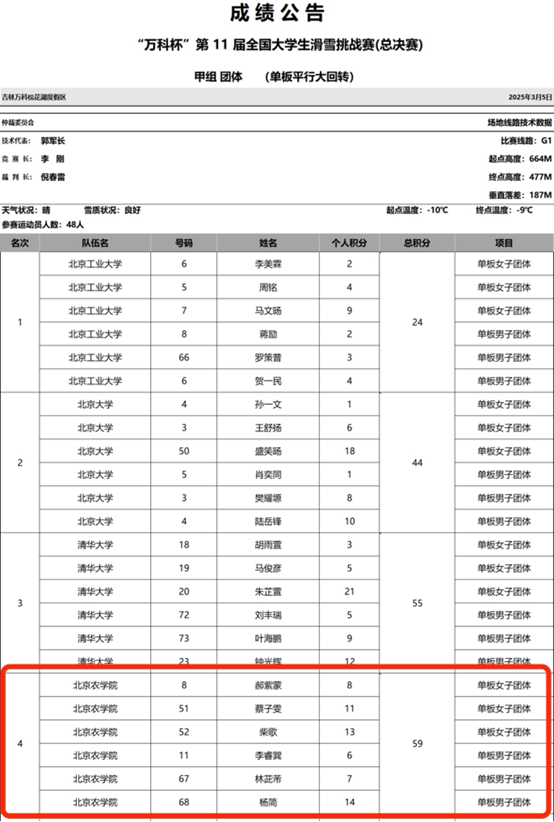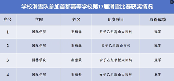 在首都高等学校第17届滑雪比赛中,2023级食品科学与工程专业(中外合作办学)本科生王炳森斩获男子乙组高山大回转和高山回转两项冠军,2023级农业资源与环境专业(中外合作办学)本科生王靖舒斩获女子乙组高山大回转亚军。2024级食品科学与工程专业(中外合作办学)本科生杨简则作为学校滑雪队主力成员之一,在“万科杯”第11届全国大学生滑雪挑战赛(总决赛)中荣获单板平行大回转甲组团体总分第四名。