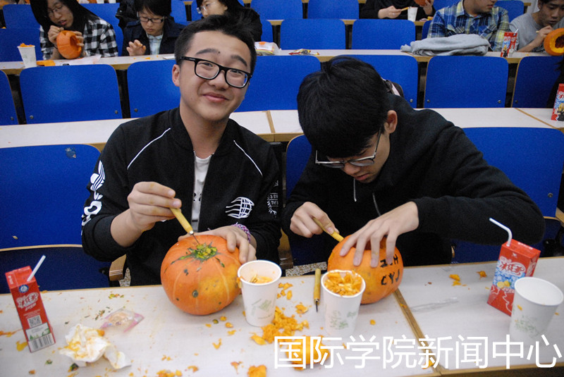在位于阶一教室的“乐鱼杯南瓜灯雕刻大赛”中,同学们通过观看“南瓜灯制作短片教程”学习,并经“去盖”“挖籽”“雕刻”三个步骤,亲自设计并动手制作一个南瓜灯。南瓜的清香在阶一教室中弥漫,渲染出了万圣节特有的气氛。