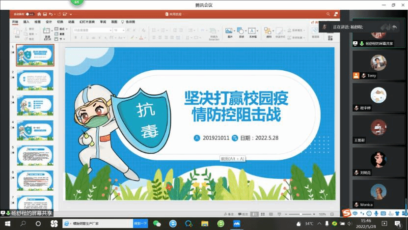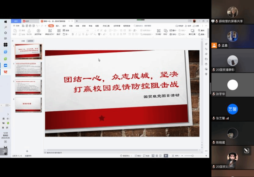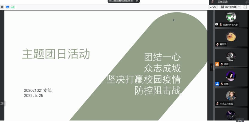 团委有计划、分层次地组织各支部召开“团结一心,众志成城,坚决打赢校园疫情防控阻击战”主题团日活动,实现全覆盖,全员发言、表决心。一是认同国家防疫政策方针,坚定“四个自信”;二是认清全国和北京疫情形势;三是支持配合校园和社会防控措施,自觉做表率;四是发挥团员青年先锋队突击队作用,坚持打卡、做核酸、接种疫苗、不出校园、不外卖不网购。各团支部采用学习讨论、心得分享、经验共享、海报制作、短视频等多种方式进行开展。在线上会议中,同学们积极发言,展开讨论,深感团员责任之重大。